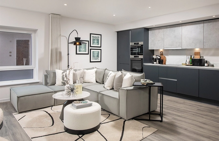 Located on the first floor, Plot 13 is a luxury one bedroom apartment finished to a high specification that features elegant and durable worktops, state-of-the-art Bosch appliances, and luxurious flooring throughout. This combination of premium materials and technology creates a perfect blend of style and functionality, offering the pinnacle of modern design.