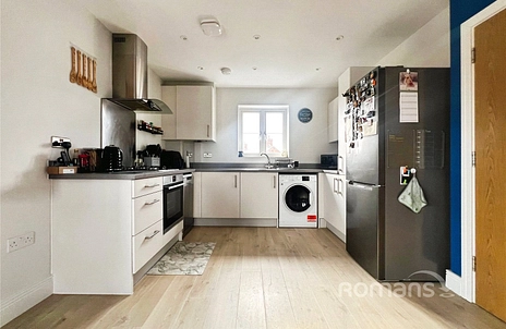 This smartly-presented flat is on the top (second) floor and has an approximately twenty-five-foot reception room with attractive flooring, a spacious, open-plan kitchen area and windows on three sides. The bedroom is a good-sized double and includes a fitted wardrobe. A pair of built-in storage/utility cupboards have been provided in the naturally-lit entrance hallway and the bathroom is simple, stylish and modern. The block is part of a recently-constructed development. Well insulated walls and roof, high performance glazing and gas central heating have resulted in very good energy-efficiency ratings. The flat comes with use of an allocated parking space, ample visitors parking and is also within walking distance, or brief cycle ride, of Ash Railway Station.