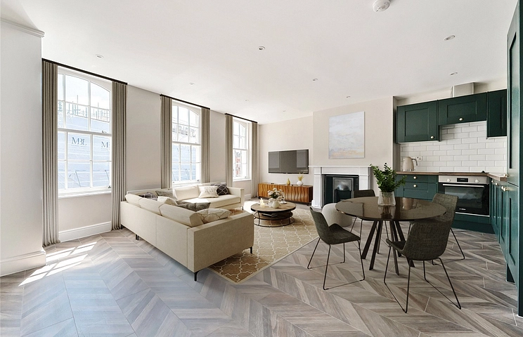 Bathed in natural light from large feature sash windows, the apartment boasts a warm and inviting feel from the moment you step inside. The open-plan kitchen, living, and dining area is perfect for both entertaining and relaxing, complete with sleek integrated appliances and finished with elegant herringbone-style flooring throughout. The spacious double bedroom offers a quiet escape from the buzz of the town, complemented by a contemporary en suite shower room.