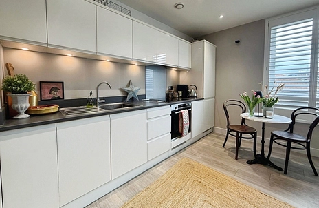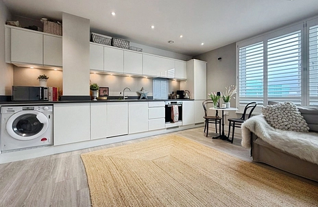 Comprising an inviting open-plan layout with a modern kitchen/living area, well-appointed bedroom, and a sleek bathroom. The bedroom is a great size with built-in wardrobes and access to the bathroom. The kitchen is equipped with high-quality appliances, including a built-in fridge/freezer, slimline dishwasher, induction hob and oven and the hallway also has additional storage. The current owner has added high quality shutters throughout the apartment.