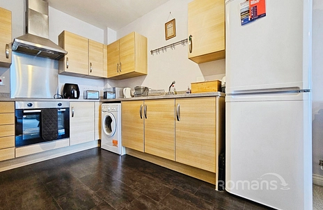 The living room is open plan to a modern kitchen that has fitted oven and hob. The living area also has French doors opening onto the balcony.