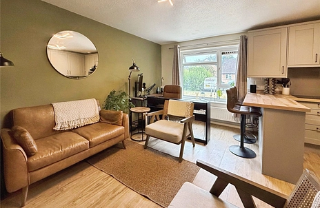There's a neat and tidy patio to the front, and the neighbouring residents have made the most of the land opposite creating a shared garden for all to use. As you step through the door the open plan kitchen/ living space is at the rear of the home. There's a surprisingly large kitchen with plenty of worktop space and cabinetry and a handy breakfast bar. The living room is spacious enough to enjoy plenty of seating as well as capacity for a desk (and a piano!) for those working from home. The double bedroom leads directly through to a large modern bathroom. Along the hallway there are four large storage cupboards which is an unusual but fantastic feature. Interestingly this home's electric sockets and doorways are already wheelchair friendly, as this flat was previous adapted for disabled residents. Externally, there's residents parking area and plenty of additional on road space for visitors.