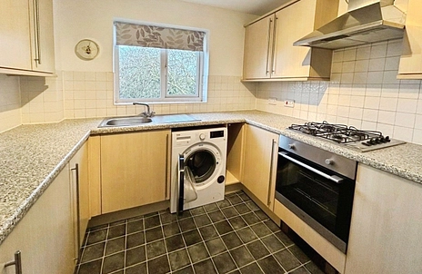 The property benefits from a spacious and bright living room, featuring large windows that provide excellent natural light and elevated views across the town. The separate, fully fitted kitchen is well appointed with a range of contemporary units, ample worktop space, and integrated appliances, offering a practical and well-defined cooking area away from the main living space.