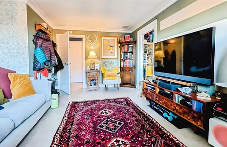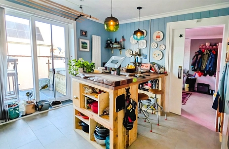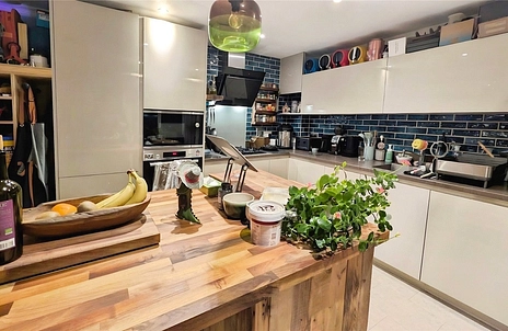 Step inside and you’re greeted by a welcoming entrance hall with secure entry phone, setting the scene for this lovely apartment. The cosy living room feels bright and cheerful, with sunlight streaming in through the large window, and plenty of space to relax or entertain. The current owner has cleverly created a stylish divide between the kitchen and living area with a bespoke wall that’s perfect for mounting a TV, while handy pocket door give you flexible living: open them up for sociable evenings, or close them for quiet, snug downtime. The modern kitchen flows out onto the balcony with lovely views over the park, ideal for morning coffee or dining al fresco in the warmer months. An additional island, thoughtfully added by the owner, provides extra storage and a brilliant place to chat, cook and dine.