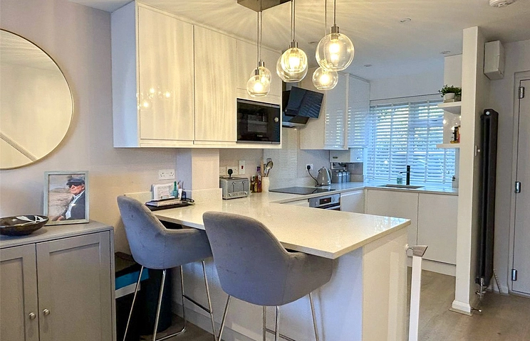 This 2-bedroom property boasts a spacious open plan living area with a recently refurbished kitchen featuring modern appliances, a south facing garden with additional shed/ office including lighting and power.
