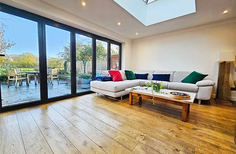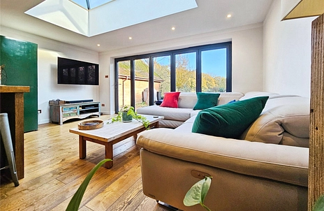 Extended to the rear to create a fabulous focal hub of the house. Featuring a colourful kitchen with built in appliances and an island with seating space. There is living space beneath a large ceiling lantern flooding the area with natural light whilst bi-fold doors right across the back add to the feeling of space and light and bring house and garden together seamlessly. Wooden flooring and a wood burning stove add to the ambience of the room.