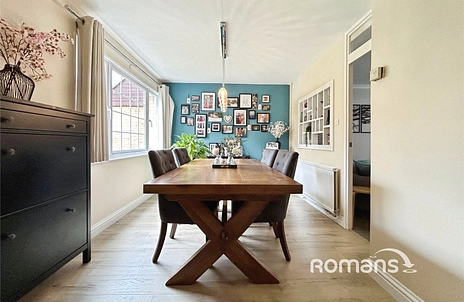 The property boasts two spacious reception rooms. The first is a generously extended lounge, benefitting from a fireplace, a skylight that floods the room with natural light and doors providing direct access to the garden, perfect for relaxing in all seasons. The second reception room is a dedicated dining room with large windows, easy access to both the kitchen and lounge, along with two useful cupboards for storage.