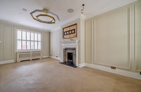 Drawing room, showcasing a stunning feature fireplace, elegant herringbone wood flooring, ceiling home audio and a stylish open staircase.