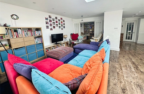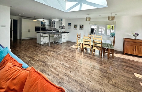 The open-plan kitchen/dining/breakfast room forms the true heart of the home, flooded with natural light from a large overhead skylight. Designed with both everyday family life and entertaining in mind, this space offers a warm, sociable atmosphere, perfect for gatherings and relaxed evenings in. The kitchen itself has been refitted to a high standard, featuring a range of high-quality integrated appliances, ample storage, contrasting worktops, spotlights, and a breakfast bar. Striking bi-fold doors open directly onto the rear garden, seamlessly blending indoor and outdoor living.