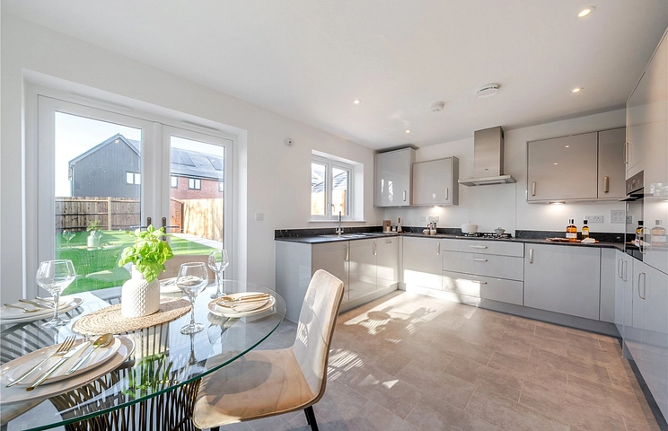 On the ground floor, the open plan kitchen and dining room creates a bright, sociable heart to the home, with French doors that open directly onto the rear garden – perfect for relaxed mornings or summer gatherings. A spacious living room provides an inviting place to unwind, while a handy utility cupboard and downstairs toilet add everyday convenience. The fully fitted kitchen includes integrated appliances such as an oven, hob, and hood, bringing both style and practicality together.