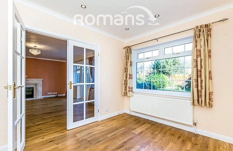 Outside, the rear garden is mainly laid to lawn with a patio area suitable for outdoor dining. To the front, the property benefits from driveway parking and a detached double garage.