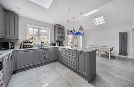 Boasting four well-appointed bedrooms, this property is perfect for families seeking a comfortable and modern home with an open plan layout. The ground floor features dual skylights to the rear, creating a bright and airy kitchen and dining area. The modern kitchen offers modern appliances with ample storage space, and a dining area that opens out onto a lovely South East facing garden.