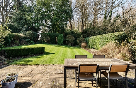 The beautifully maintained rear garden offers a high degree of privacy and seclusion, framed by mature trees and well-established shrub borders. A generous patio terrace provides the perfect setting for outdoor dining and entertaining, while the expansive manicured lawn creates a tranquil and inviting outdoor space.