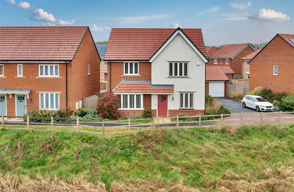 Presenting a unique opportunity with no onward chain, this detached former show home, built by Bloor Homes, adorns a generous corner plot with vast views over the protected meadow and has never been lived in and is in brand new condition.