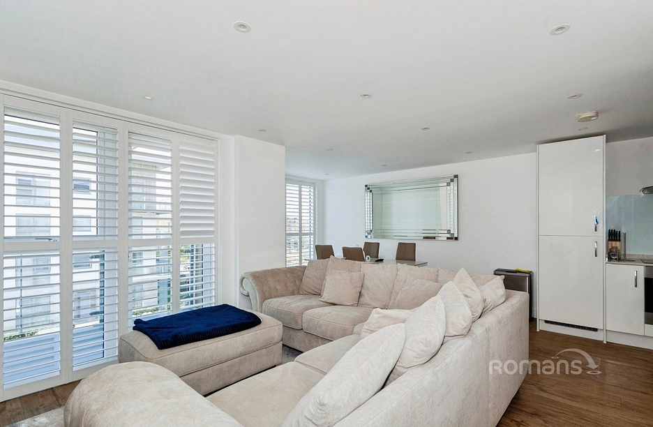The property features a bright open-plan reception room with large windows and access to the balcony, creating a welcoming space for everyday living and dining. The modern open-plan kitchen benefits from natural light and bespoke shutters, providing a practical and well-finished cooking area.